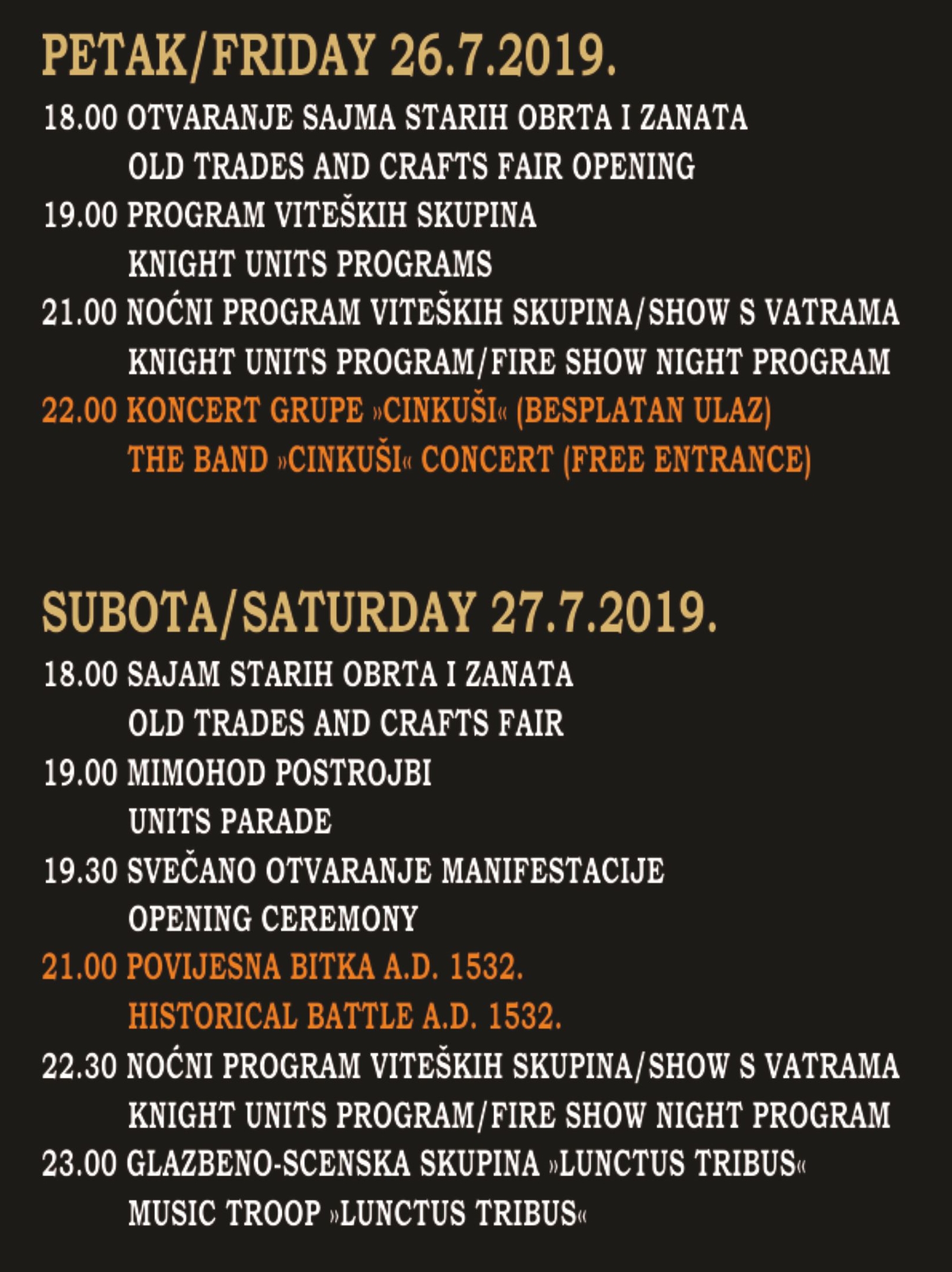 The central event is historical re-enactment of the battle (1532) between Klis defenders Uskoks and Ottomans. At a time when Renaissance was blossoming in Western Europe and at the same time when the fear of powerful Ottoman army, which had unstoppably progressed to conquer Europe, was growing, Klis and its defenders Uskoks were the first line of defence and bled for benefit of the whole Europe. The battle from this heroic period of Klis history is depicted by trained and skilled members of historical units and knight groups from various parts of Croatia, Slovenia, Bosnia and Herzegovina, Slovakia and Czech Republic. Re-enactment of the siege, assaults, defending, negotiation, conquest, raiding, individual and collective battles with swords, spears, maces, war-hammers, firing cannons and firelocks...